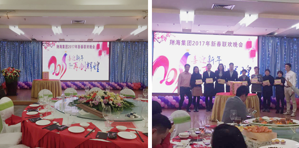 把酒当歌歌声在,闻鸡起舞舞新春。 1月21日翔海集团举行了一年一度的新春联欢晚会。集团公司对全体员工的辛勤付出和敬业精神表示肯定和赞扬,并送上了新年的祝福。晚会期间还有特别嘉宾——“财神爷”为大家带来惊喜,让员工们激情澎湃。公司领导与员工的亲情互动、激动人心的抽奖活动,让歌声、掌声、欢呼声一直在晚会上荡漾。 感恩翔海,携手共进,再创辉煌!
