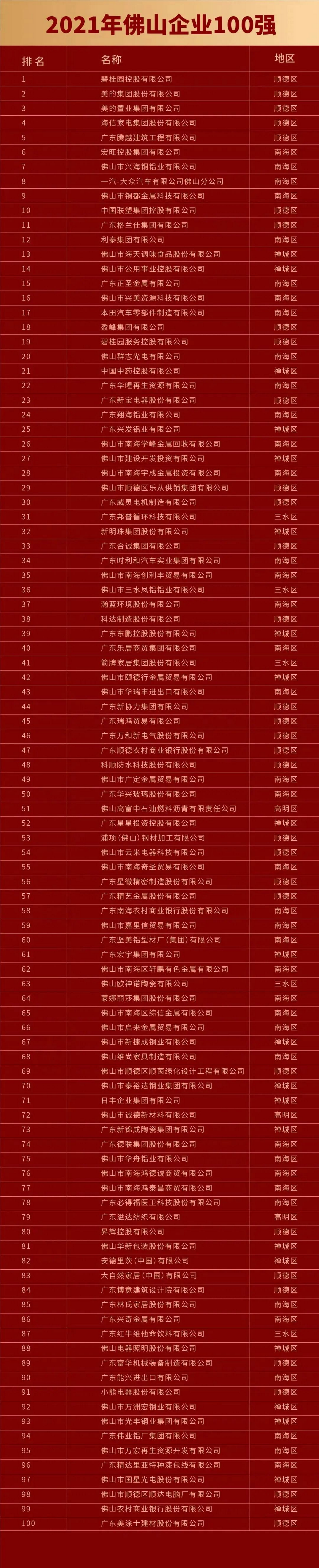 11月20日,在2021年佛山市企业家活动日暨佛山企业100强、制造业100强企业发布会上,佛山市企业联合会、佛山市企业家协会现场发布了“2021年佛山企业100强”榜单。